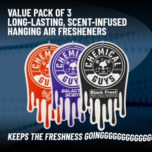 Choose your own scent story with this variety pack of three premium hanging air fresheners. Signature Scent has a tantalizingly warm. vanilla-based aroma. Galactic combines notes of wood. berries. and musk. while Black Frost’s cologne-inspired scent invigorates the senses.??