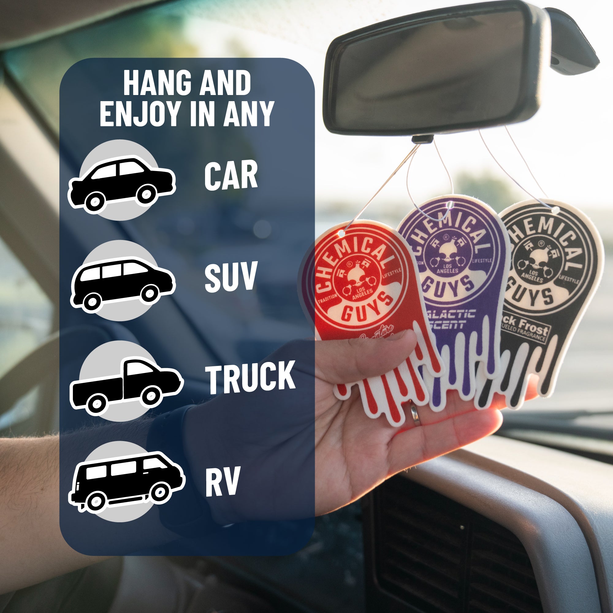 Choose your own scent story with this variety pack of three premium hanging air fresheners. Signature Scent has a tantalizingly warm. vanilla-based aroma. Galactic combines notes of wood. berries. and musk. while Black Frost’s cologne-inspired scent invigorates the senses.??